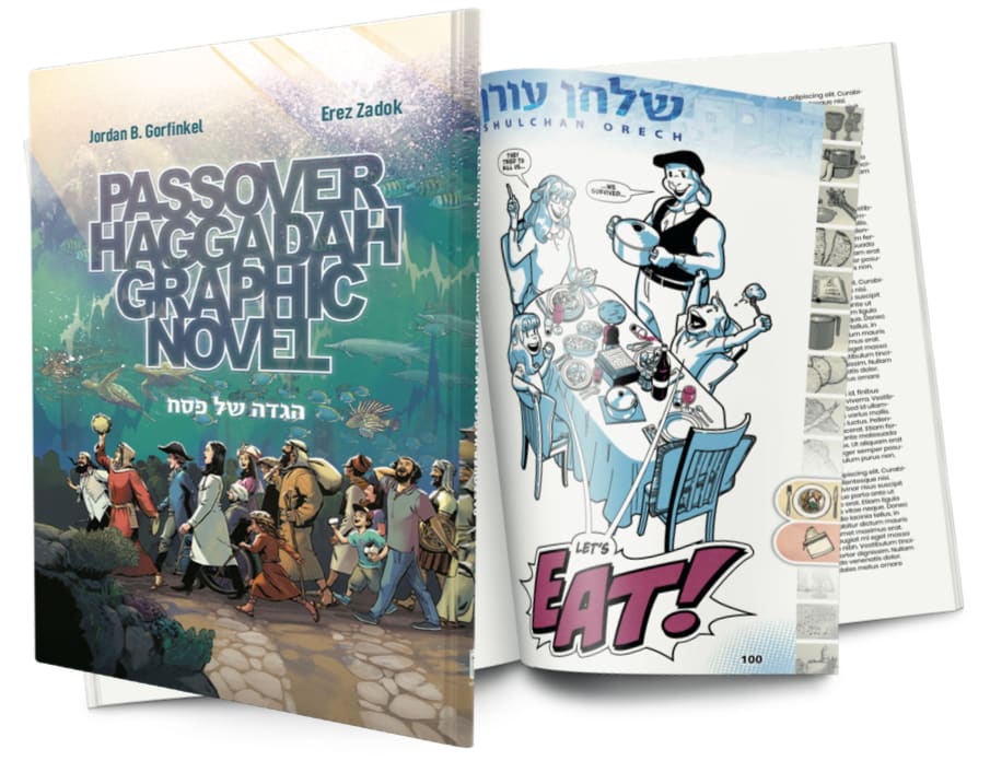 This may be because of creator Jordan B. Gorfinkel’s background. The cartoonist—also known as “Gorf”—not only innovated the weekly, Jewish-themed comic strip “Everything’s Relative” (JewishCartoon.com), he was a Batman editor at DC Comics and one of the creators of the superhero team Birds of Prey. The Haggadah was published by Koren in cooperation with Gorfinkel’s studio, Avalanche Comics Entertainment.