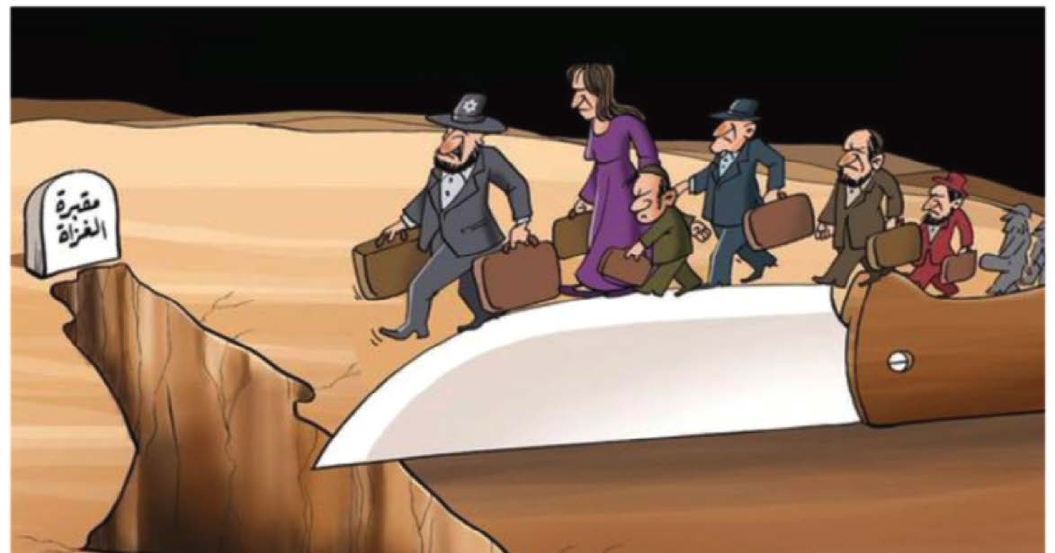 As I write this, violence has spread across Israel—from Yerushalayim to Petach Tikva, Gush Etzion, Kiryat Gat, Tel Aviv, Afula, Kiryat Arba and elsewhere—bringing countless new attacks and new tragedies, and ever more families mourning the loss of loved ones. How do we persuade the world to take notice, to care? How do we persuade the world that these heinous acts are not—and can never be equated with—political actions by rivals on the geopolitical stage? If only we could take the world by the neck and shake it until it recognizes that these acts are murders, perpetrated by madmen filled with the hatred of Jews—murderers no different than marauding bands of Crusaders; murderers no different than rampaging Cossacks; murderers no different than those who slaughtered six million kedoshim because they were Jews. Today, these murderers are nourished by the culture of hate that permeates the Palestinian media and is imbedded in their schools. Just look at the image above—a cartoon displayed prominently on Palestinian social media, depicting Jews walking on a knife blade towards a grave shaped like, in their words, “Greater Palestine.” The headstone reads: “Cemetery of the invaders.”
