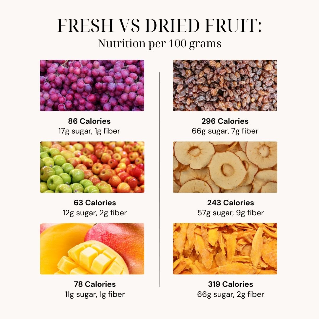 Fresh fruit is typically the healthier choice when it comes to overall nutrition. It tends to be lower in calories and sugar, higher in water content and offers a broader spectrum of vitamins and minerals. Dried fruit, on the other hand, is more concentrated, meaning it contains more sugar and calories per serving. This concentration can make dried fruit a less ideal choice for those looking to maintain balanced blood sugar levels.