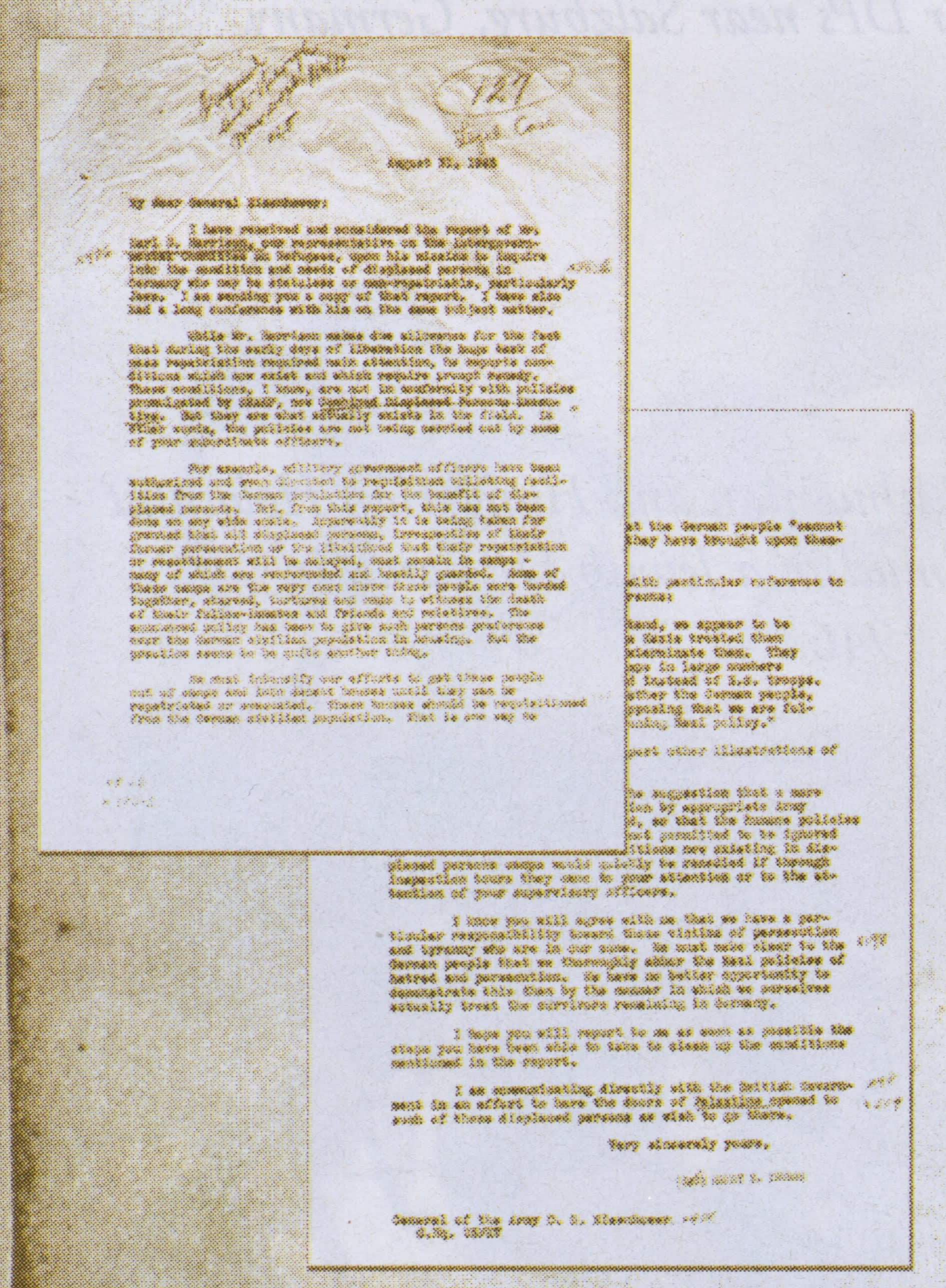 President Harry S. Truman directing General Dwight D. Eisenhower via cable to make the welfare of the Jewish DPs the “particular responsibility” of the United States. In the post World War II years, the military evolved into a force to shelter Jewish survivors and reconstitute Jewish life in Europe.
