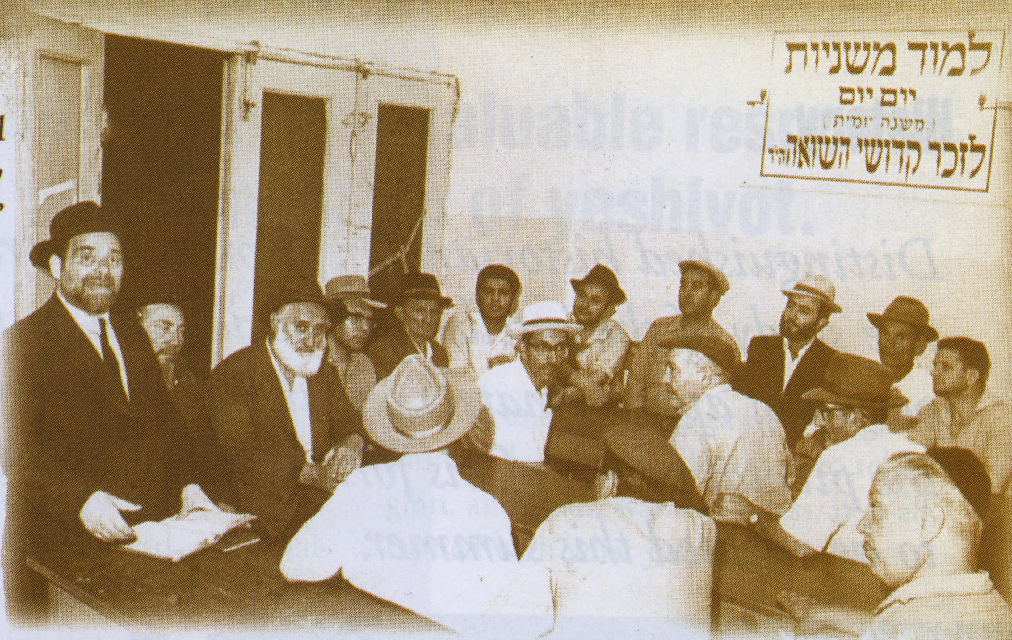 Group of DPs studying in an unidentified DP camp. A Hebrew sign reads: “Study Talmud every day in memory of those who perished in the Holocaust.”