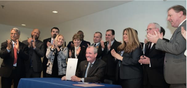 New Jersey Governor Phil Murphy, surrounded by state legislators and government officials, signs the security bill, increasing the state’s allocation to $22.6 million.