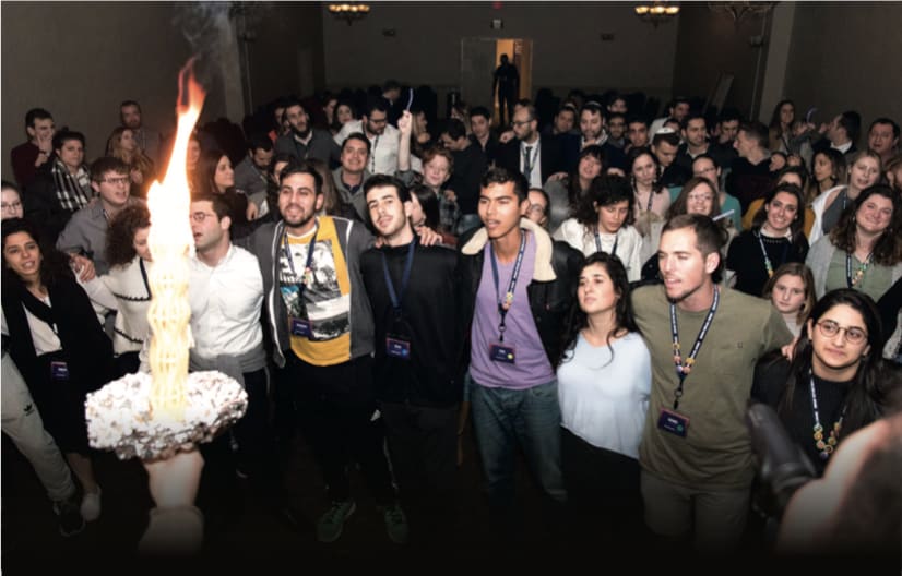Birthright Israel participants singing during a heartfelt Havdalah ceremony at a Bring Israel Home Reunion held in Connecticut this past December. Bring Israel Home, a revolutionary Birthright Israel follow-up program run by the OU, is a 100-day challenge where participants gain points by engaging in Jewish activities (eating at a kosher restaurant, visiting a synagogue, participating in a Friday night Shabbat dinner, et cetera). Those who successfully complete the challenge get to spend a reunion weekend with the Israeli soldiers from their Birthright trip.