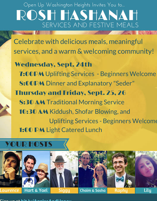 Levine and neighborhood volunteers began organizing more Shabbat meals, shiurim and Jewish events. They contacted an older synagogue in the area, Congregation Beth Hamedrosh Hagadol of Washington Heights. The shul had recently fallen on hard times and the year before didn’t manage to have a minyan for Rosh Hashanah. Open Up Washington Heights set up tables on the street where volunteers handed out flyers and apples and honey in honor of the Jewish New Year. More than 150 people visited the shul during the holiday, a third of whom were unaffiliated. Rosh Hashanah was just the beginning for the group, and they’ve broadened their programming to run monthly Shabbatons, events and even Pesach Sedarim.