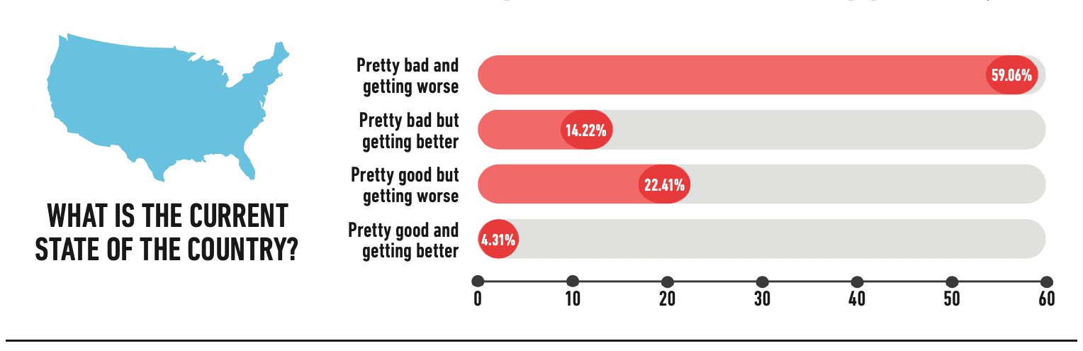 In the four communities surveyed by the CCR in June, September and October, the majority of respondents (about 82 percent) feel that the current state of the US—societally, politically, et cetera—is only “getting worse.”