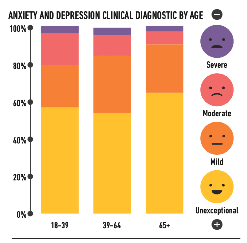 Studying how Covid has impacted people’s lives, researchers found a surprising disparity between the age groups. While the majority of respondents are not experiencing severe anxiety and depression, note the significant difference in the “moderate anxiety” column between the 18-39 age bracket and the 65+ age bracket. The younger set reports experiencing higher anxiety levels, perhaps due to factors such as less career stability or parenting young children during the pandemic.