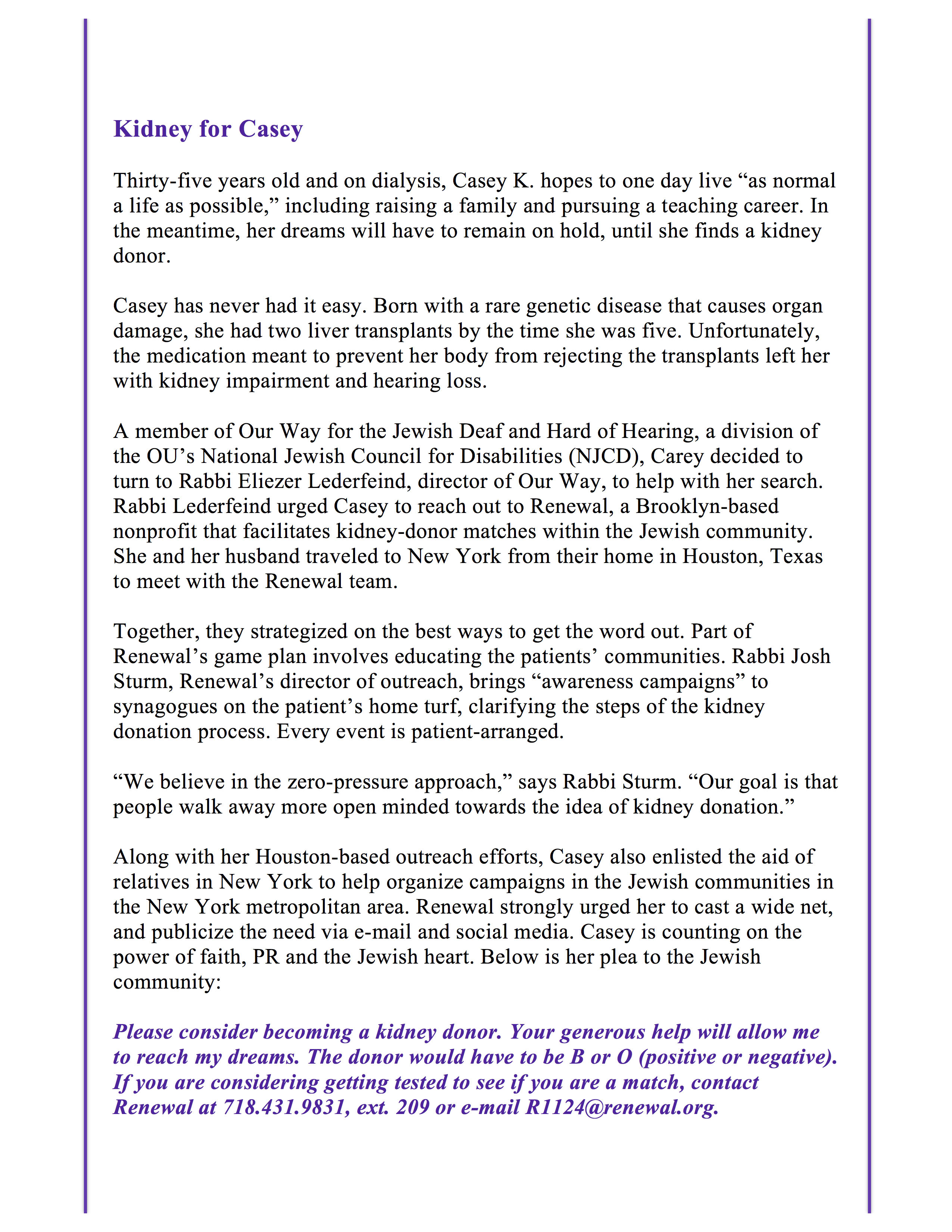 In today’s interconnected world, e-mail campaigns can have a profound impact on the success of kidney matching. Rabbi Sturm shares the story of a woman named Shayna,* who was seeking a kidney for her forty-year-old son with special needs. She contacted Renewal and initiated an e-mail campaign to find a donor for her son. The e-mail sailed around the world—from Shayna’s community in Miami to Baltimore, and subsequently to the dean of a seminary in Israel, who forwarded the plea to hundreds of the institution’s alumni. The campaign not only helped Shayna’s son find a donor, it also succeeded in finding kidney donors for two others on Renewal’s list, thereby saving three lives with one e-mail.
