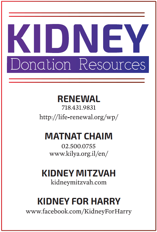 In addition to Renewal, there are a few other Jewish organizations dedicated to connecting kidney donors to recipients and to educating the population about kidney donation. In Israel, the non-profit organization Matnat Chaim educates individuals about kidney donation and provides support to donors. Its extensive web site with resources and information provides education about every step of the process.