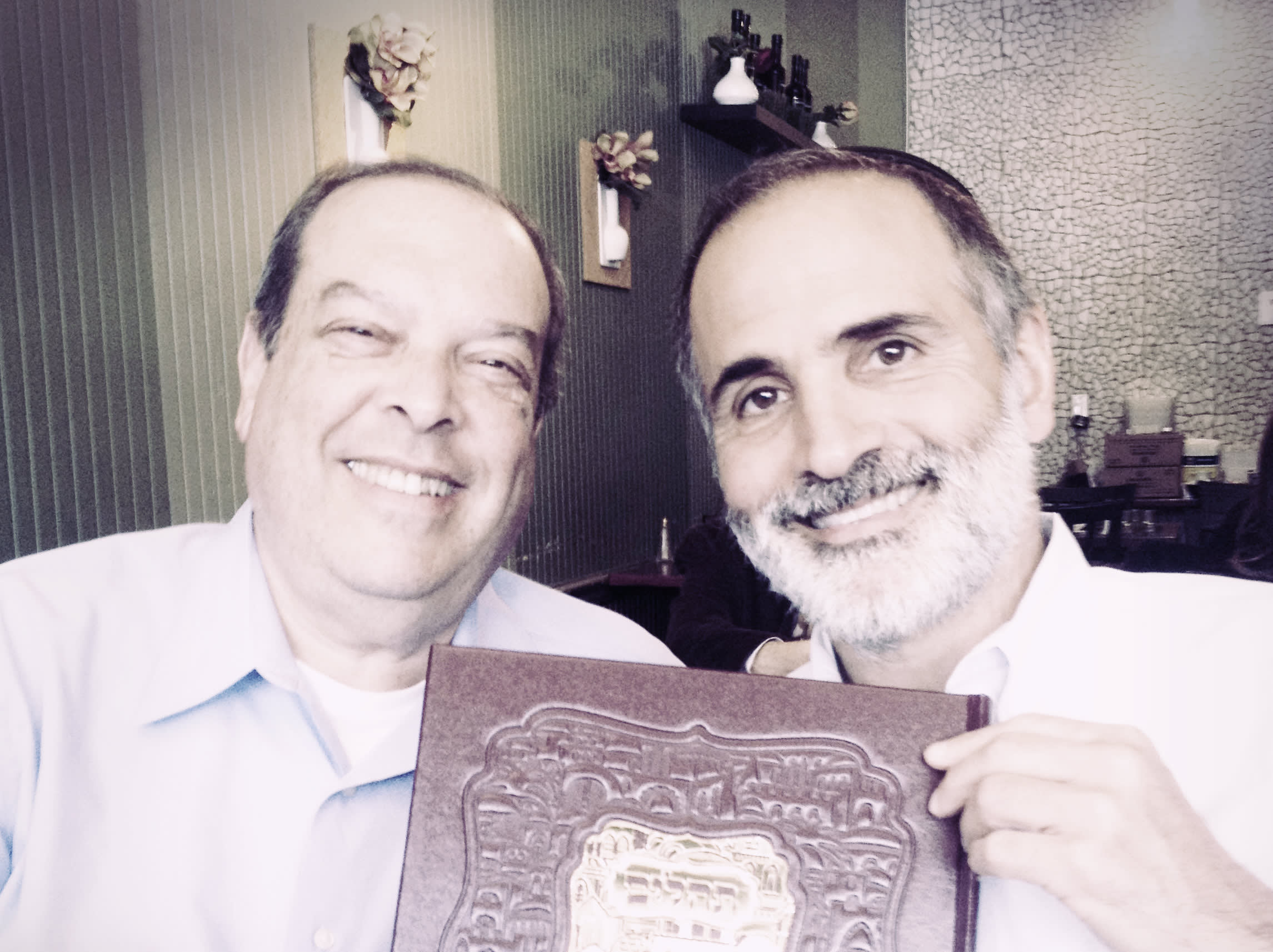 Mitch Bornstein (left) and A. J. Gindi, six months after A. J. donated a kidney to Mitch. The two are holding a Sefer Tehillim that Mitch had comissioned for A. J. Courtesy of A. J. Gindi