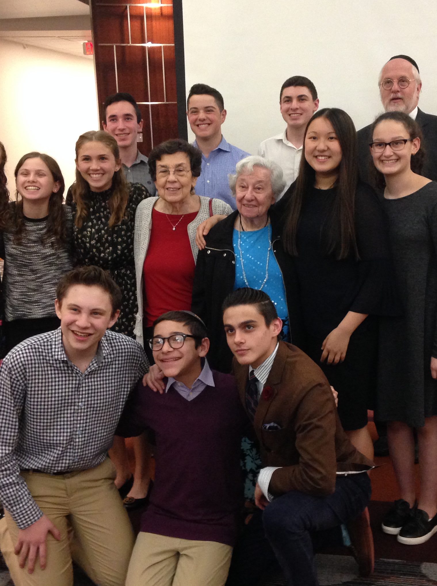 Eva Ozarowski (center) surrounded by students and staff from Ida Crown Jewish Academy in Chicago, Illinios, where she was honored by Yad Vashem in 2018 for her participation in the Generation to Generation program. Courtesy of Rabbi Joseph Ozarowski