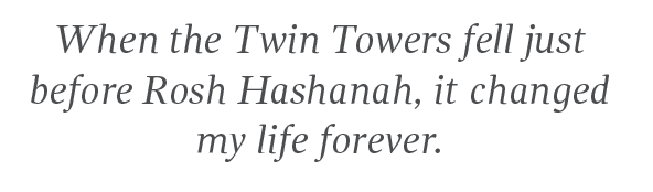 When the Twin Towers fell just before Rosh Hashanah, it changed my life forever. I will never forget those weeks and days leading up to what had been my favorite yom tov. I remember every excruciating second: waiting for news of my brother-in-law who worked at the World Trade Center; not getting good news, like every one of my friends who knew people who were there; deciding to head home to Maryland to wait it out; the car ride to my sister’s apartment to pack up her things; the long drive to my parents’ house; leaving a smoldering city skyline behind in the rearview mirror.