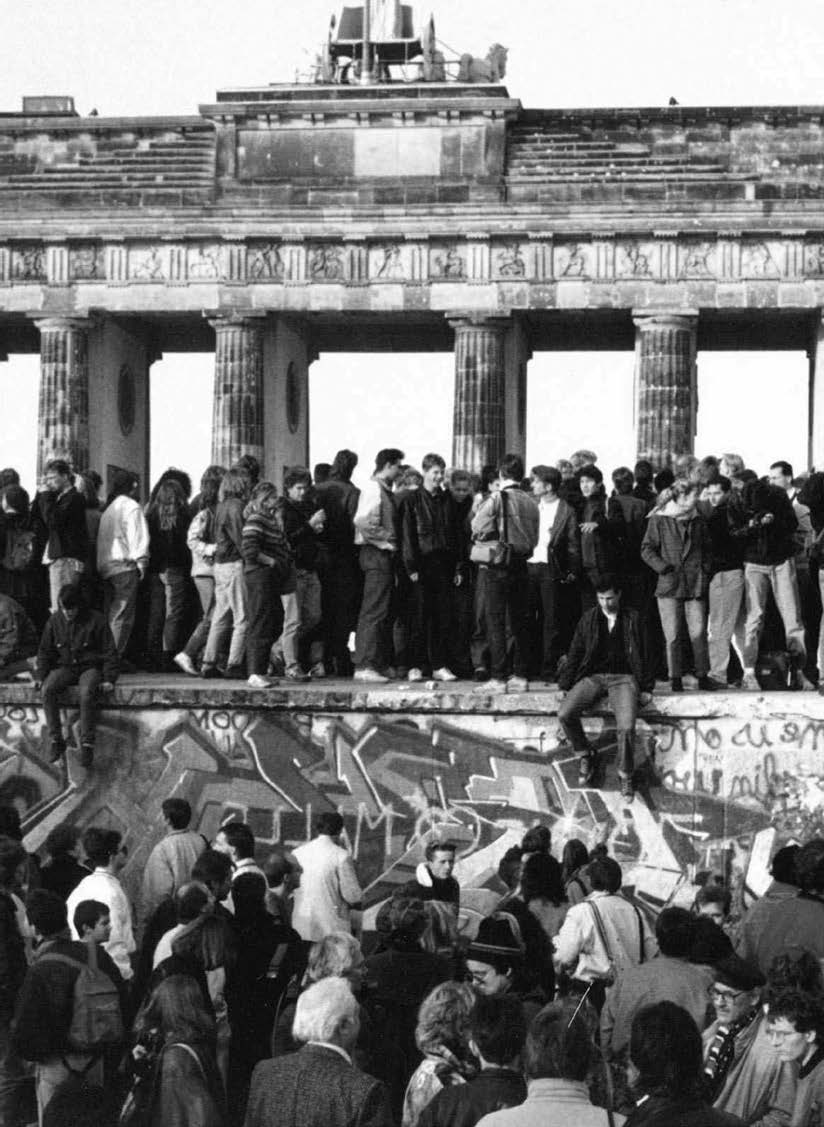 Germans from East and West standing on the Berlin Wall in front of the Brandenburg Gate, one day after the wall fell. Photo: AP Images