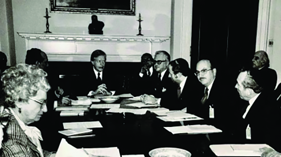 Rabbi Julius Berman with US President Jimmy Carter as part of a delegation of the World Jewish Congress-North America, in 1978. From left around the table: Freida Weiss, president of Hadassah, the Women’s Zionist Organization of America; Rabbi Arthur Scheiner, president of WJC-NA; President Carter; unidentified; Herb Berman, officer of WJC-NA; Rabbi Berman, president of the OU at the time; Rabbi Joseph Karasick, OU chairman of the Board and former OU president; and Rabbi Joseph Shern. Courtesy of Mark Karasick