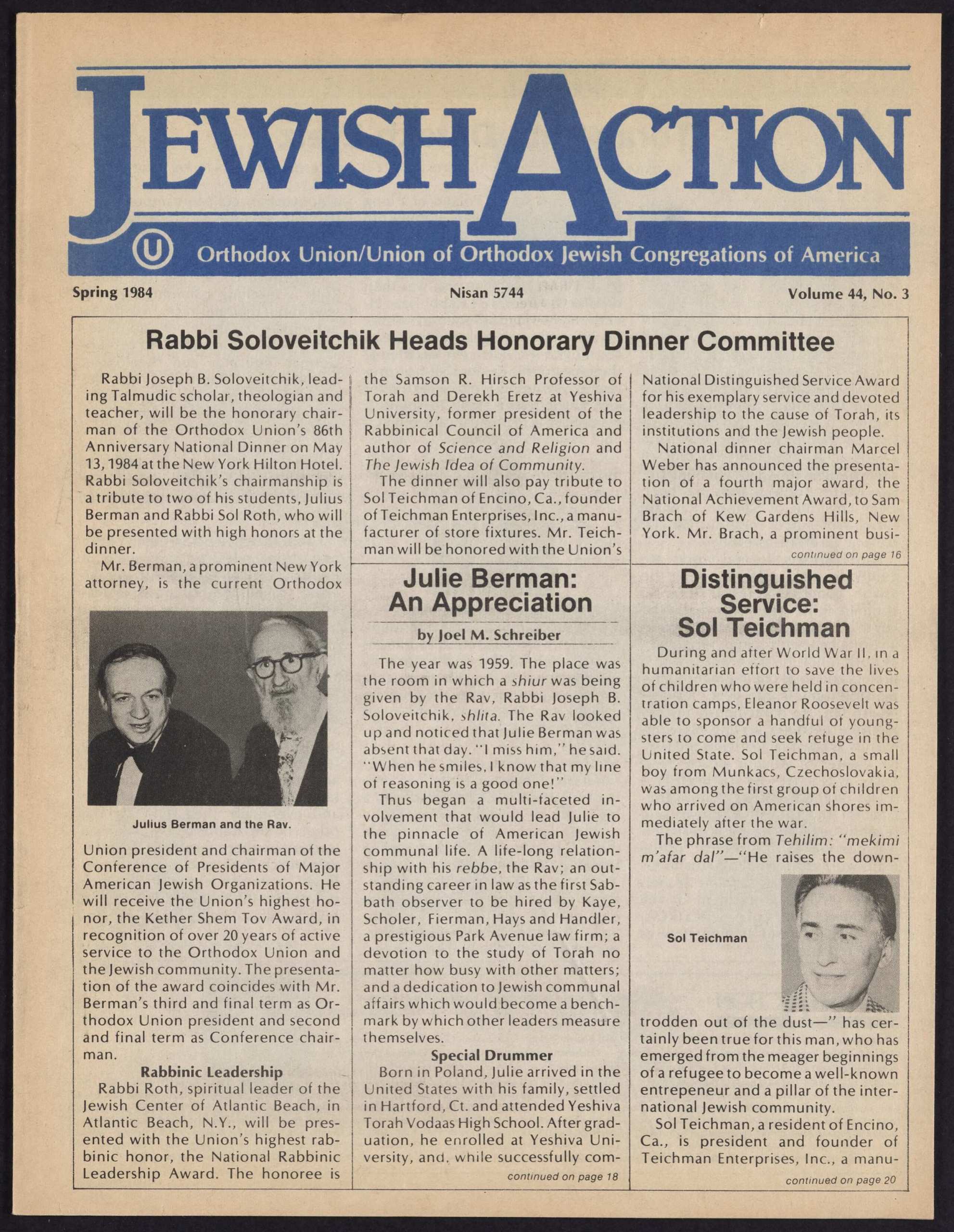 A copy of Jewish Action—when it was an organizational newsletter—dated 1984 featured the news that Rabbi Berman was to receive the Keser Shem Tov Award from the OU and included a photo of Rabbi Berman and the Rav.