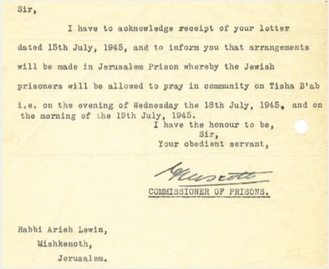 A letter to Reb Aryeh from the British Commissioner of Prisons; Reb Aryeh was constantly working to improve conditions—both physical and spiritual—for Jewish prisoners during the British Mandate.