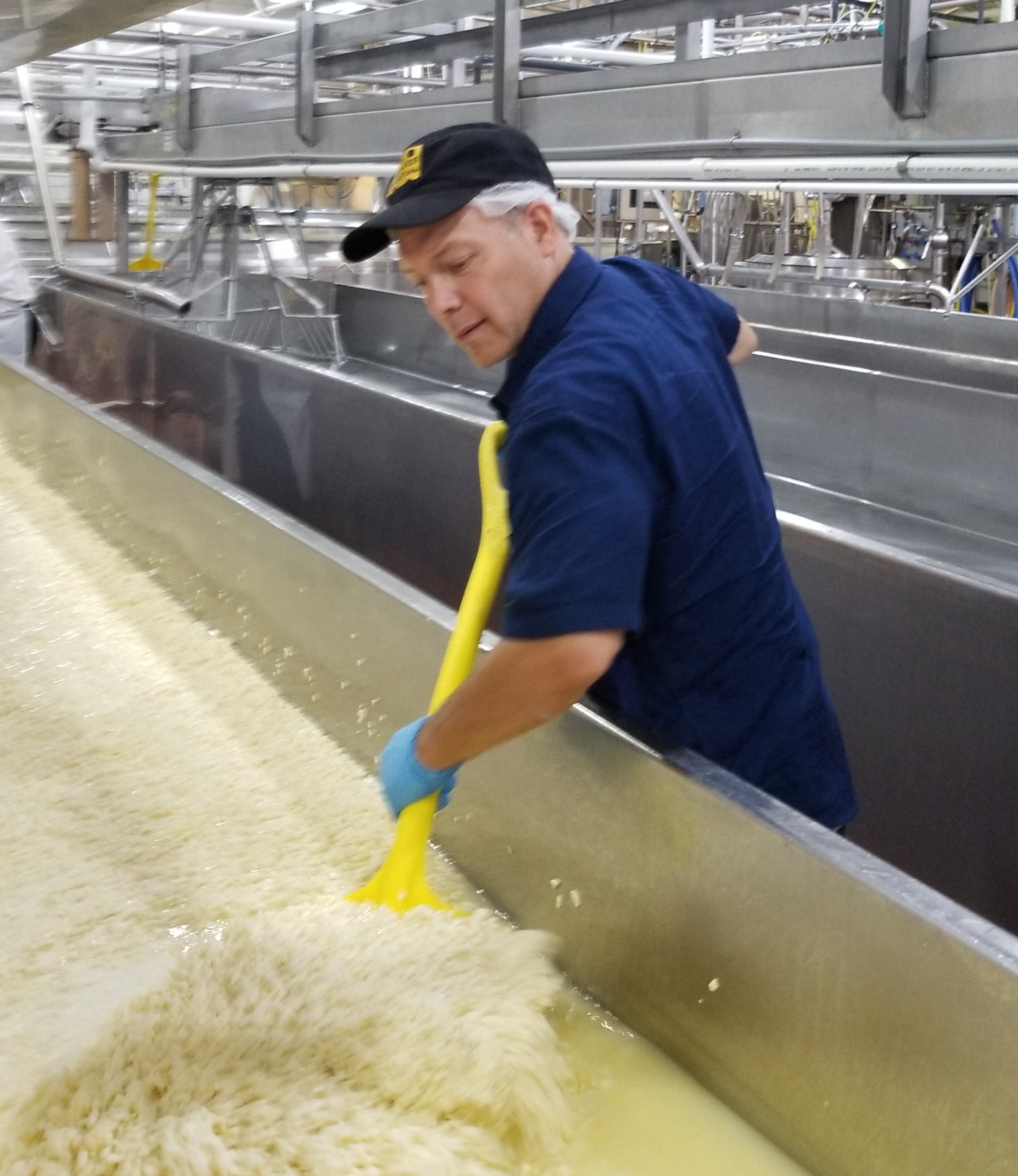 Delman stirring curds at a cheesemaking facility in Ohio. Kosher cheese production is a hands-on, detail-intensive process.