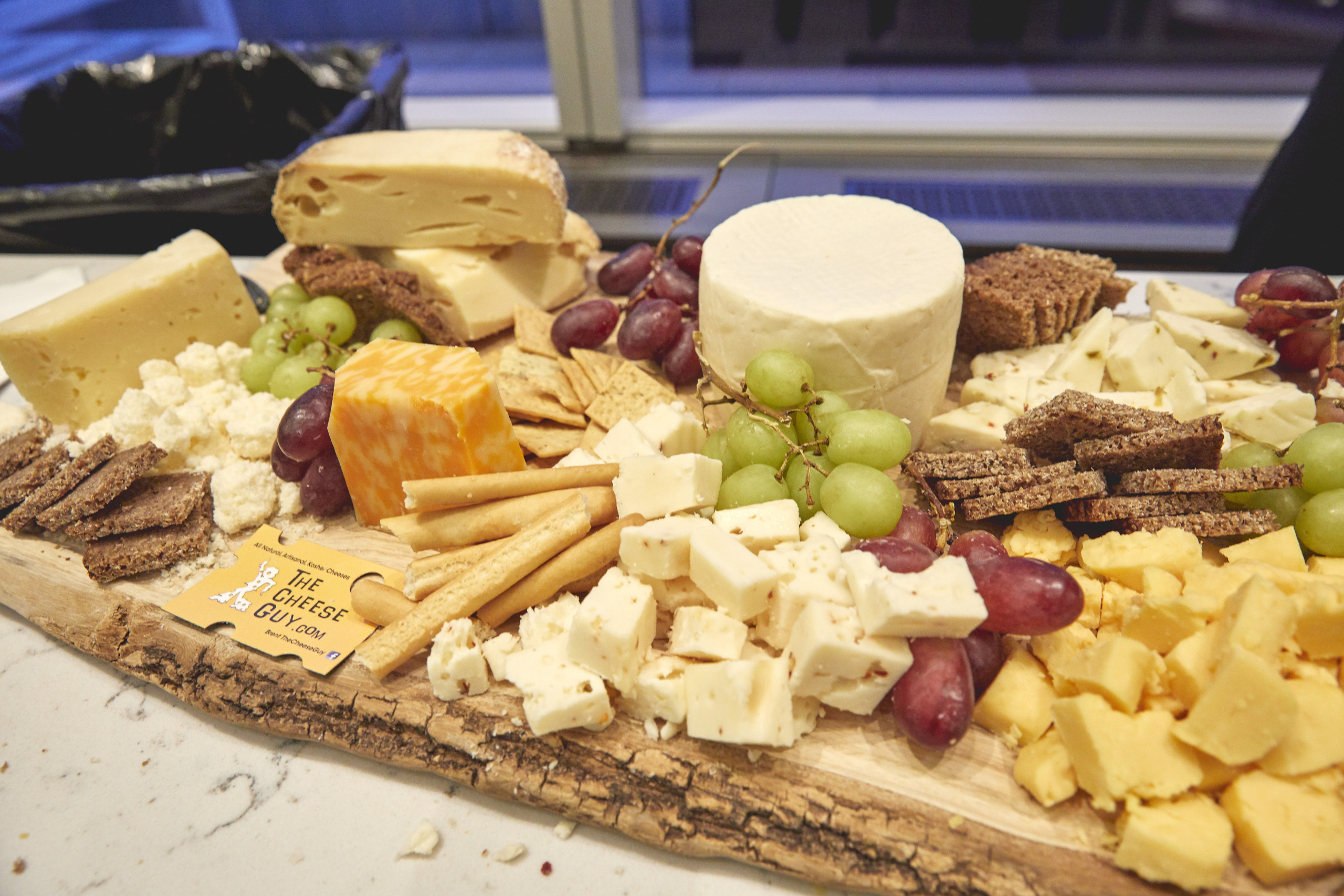 A close-up of a custom kosher cheeseboard by The Cheese Guy, for City Winery featuring aged cheddar, grapes, crackers and bold specialty cheeses.