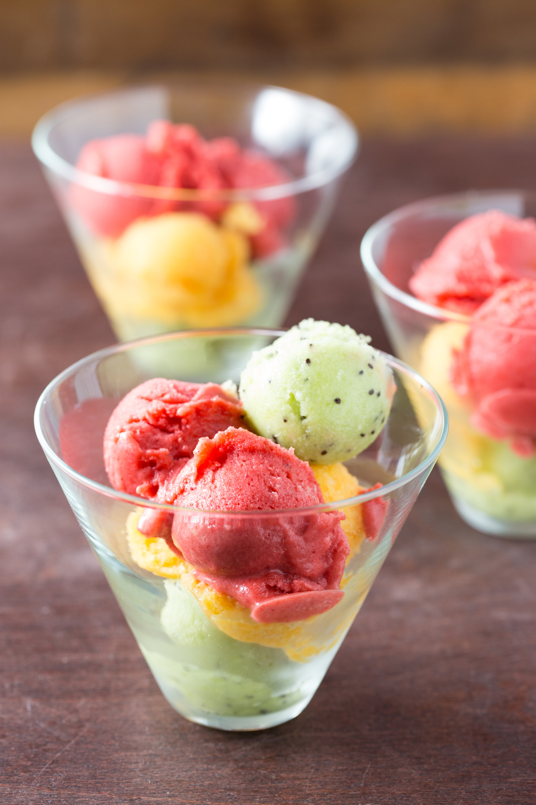 I use a melon baller to scoop out the sorbets and serve a few of each in a glass dessert bowl.
