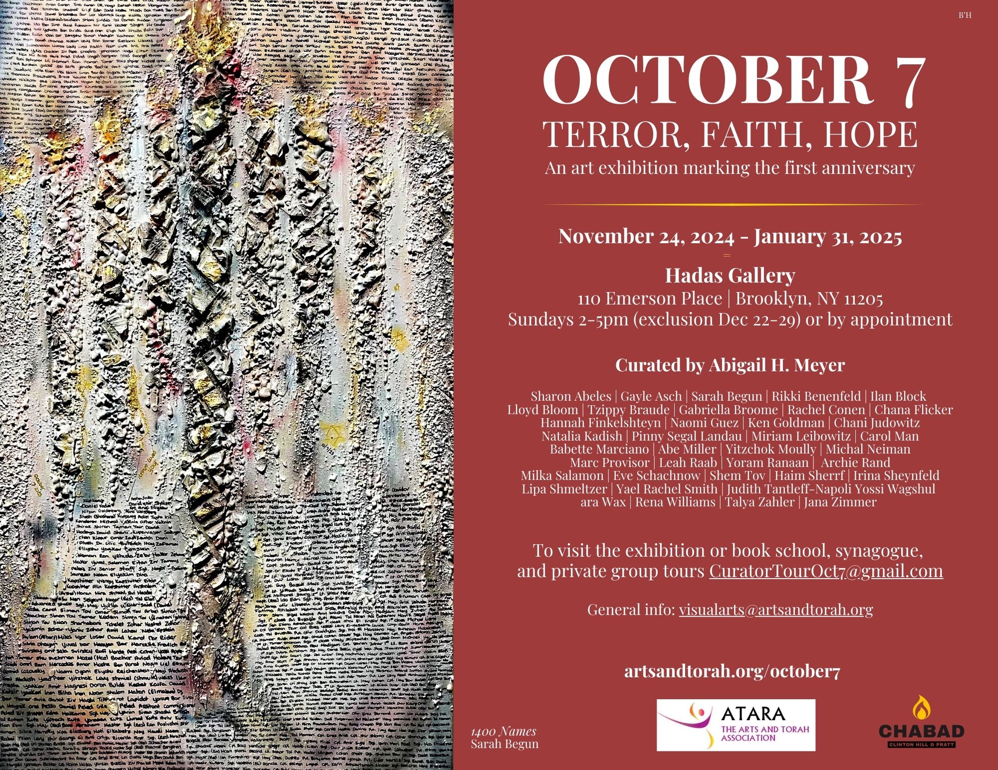 “Visual art has a unique power to communicate what words cannot,” wrote Miriam Leah Gamliel and Esther Leah Marchette—directors of ATARA, the Arts and Torah Association, which caters to female Torah-observant artists—for an October 7 exhibit catalog that closed this past winter. The exhibit, October 7: Terror, Faith, Hope, which ran in partnership with ATARA, offered “a sacred space” and “underscores the healing power of creative expression and highlights the extraordinary depth and talent within our community.”